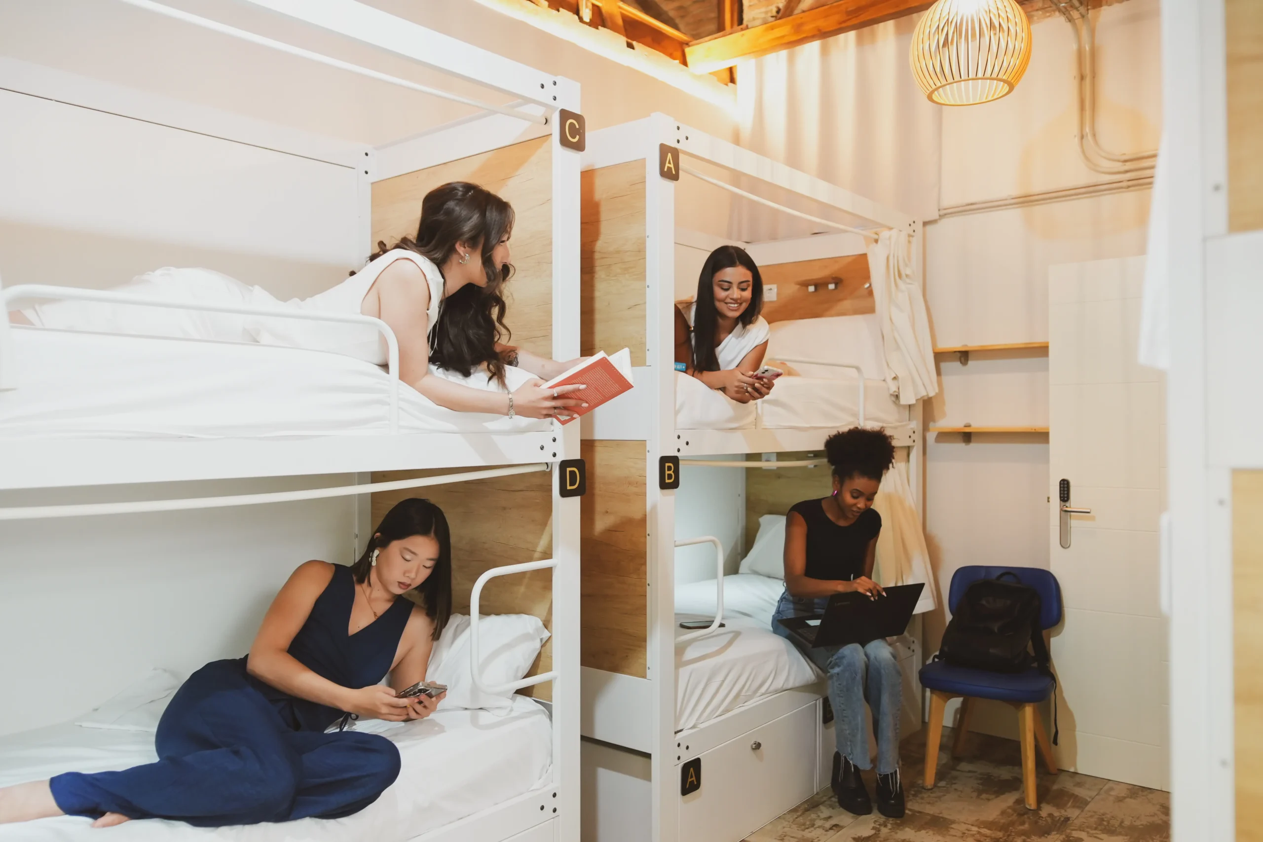 Todas nuestras habitaciones tienen baño privado. Habitación con 6 camas, taquilla para cada litera. Puede traer su candado propio (medida 30mm) o comprarlo en el hostel.